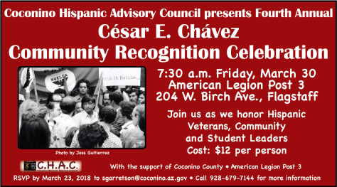 FLAGSTAFF — The Coconino County Hispanic Advisory Council (CHAC) will present its fourth annual César E. Chávez Community Recognition Breakfast from 7:30 to 9 a.m. Friday, March 30, 2018 at American Legion Post 3, 204 W. Birch Ave., Flagstaff.