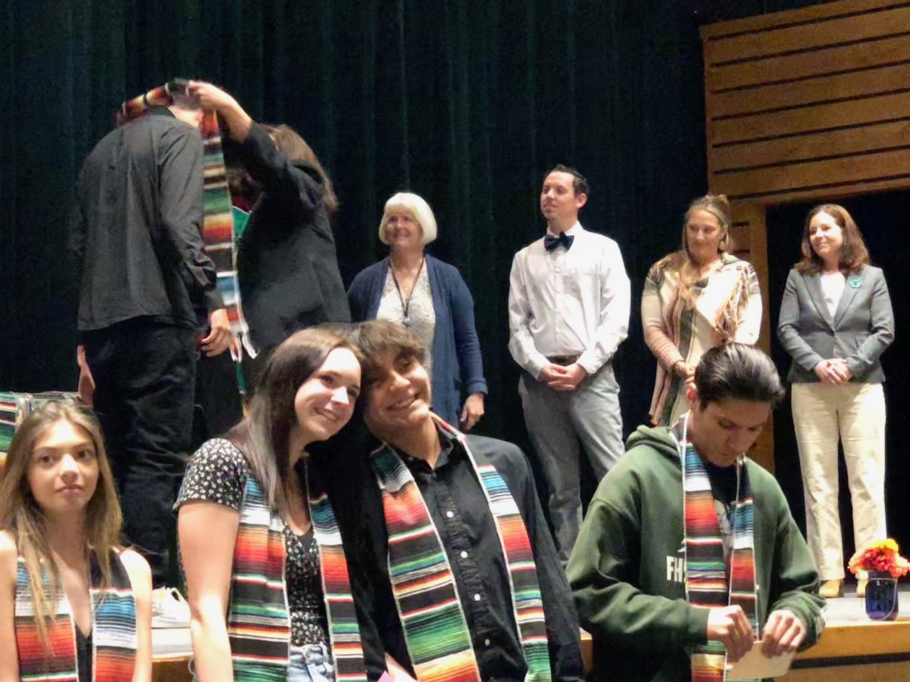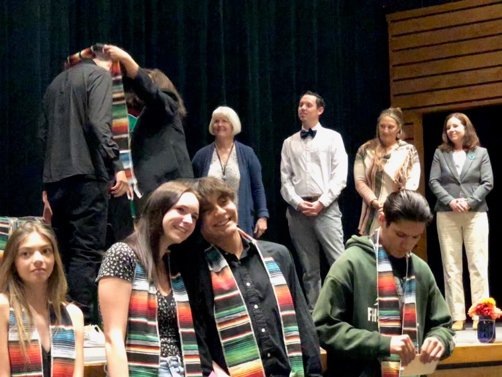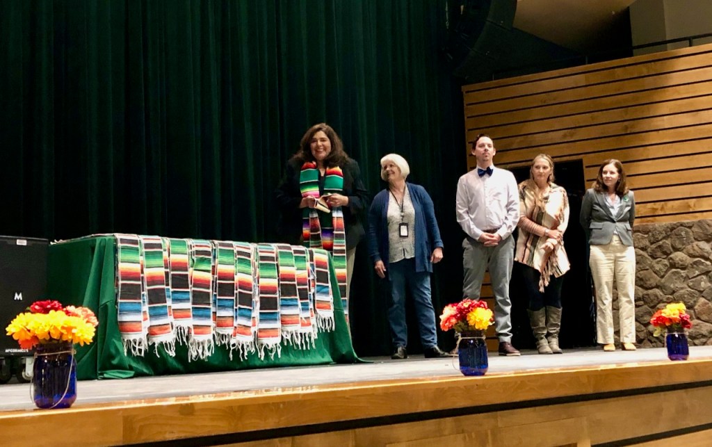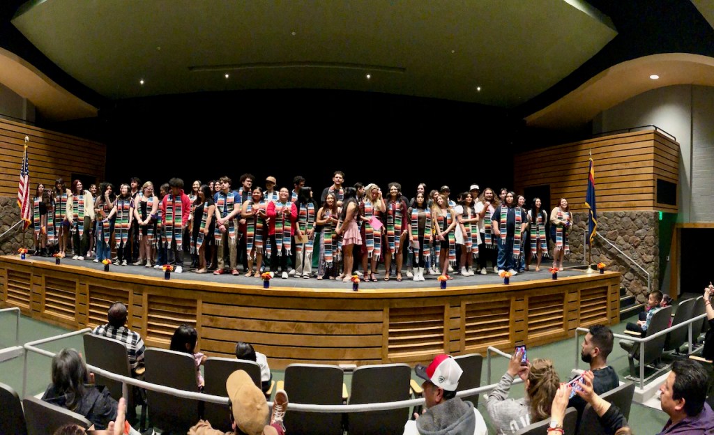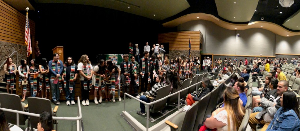 Flagstaff High School celebrated its 2023 Hispanic Convocation with the largest group of students in recent memory on Wednesday, May 10. Nearly 90 students took the stage to receive their colorful sarape sashes from new United Way of Northern Arizona President and CEO Elizabeth ‘Liz’ Archuleta, FHS Principal Libby Miller; Assistant Principal Trish Eberlein, Assistant Principal Matthew Barquin and Athletic Director Jeannine Brandel.