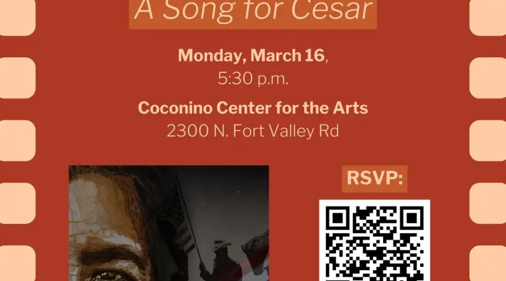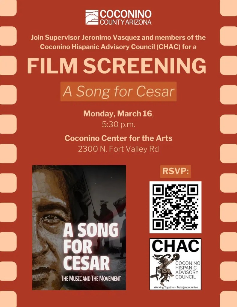 FLAGSTAFF — Join Supervisor Jeronimo Vasquez and members of the Coconino Hispanic Advisory Council (CHAC) for a film screening of A Song for Cesar! The film aims to educate generations old and new about civil rights activist Cesar Chavez’s legacy of impactful, peaceful protest.