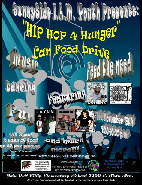 FLAGSTAFF — The Sunnyside Neighborhood Association’s I.A.M. Youth group will host the annual Hip Hop 4 Hunger Can Food Drive from 7:30 to 10 p.m. Friday, Nov. 18 at Killip Elementary School, 2600 E. Sixth Ave., Flagstaff.
