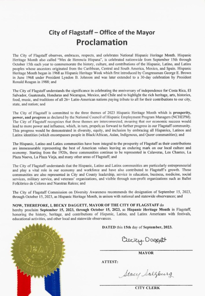 City of Flagstaff Proclaims Sept. 15 through Oct. 15, 2023 as National Hispanic Heritage Month