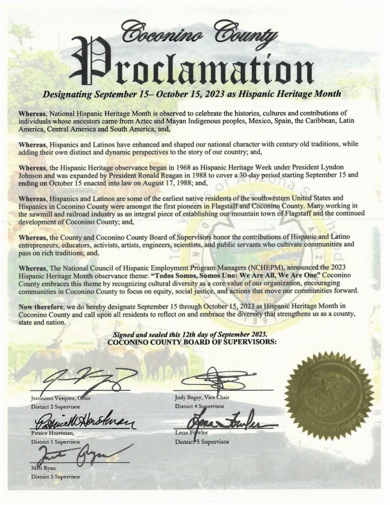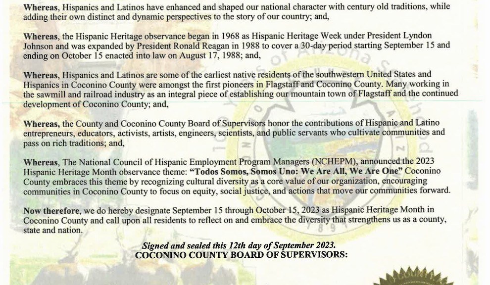 FLAGSTAFF — At their regular meeting on Tuesday, September 12, the Coconino County Board of Supervisors (Board) unanimously adopted a proclamation recognizing September 15 through October 15, 2023 as Hispanic Heritage Month in Coconino County.